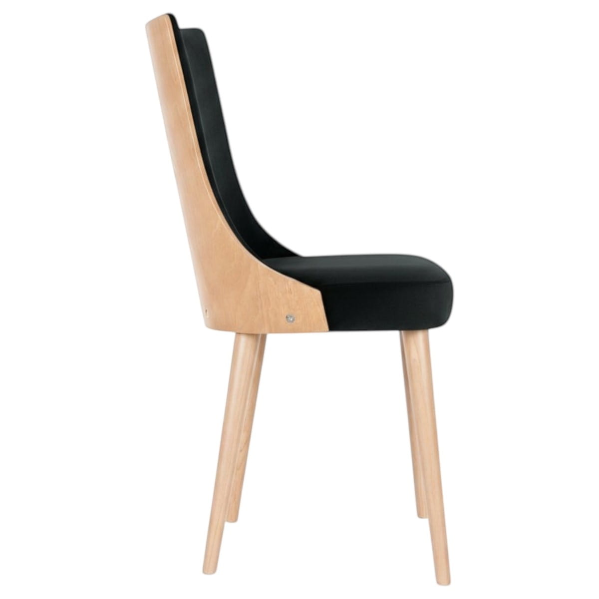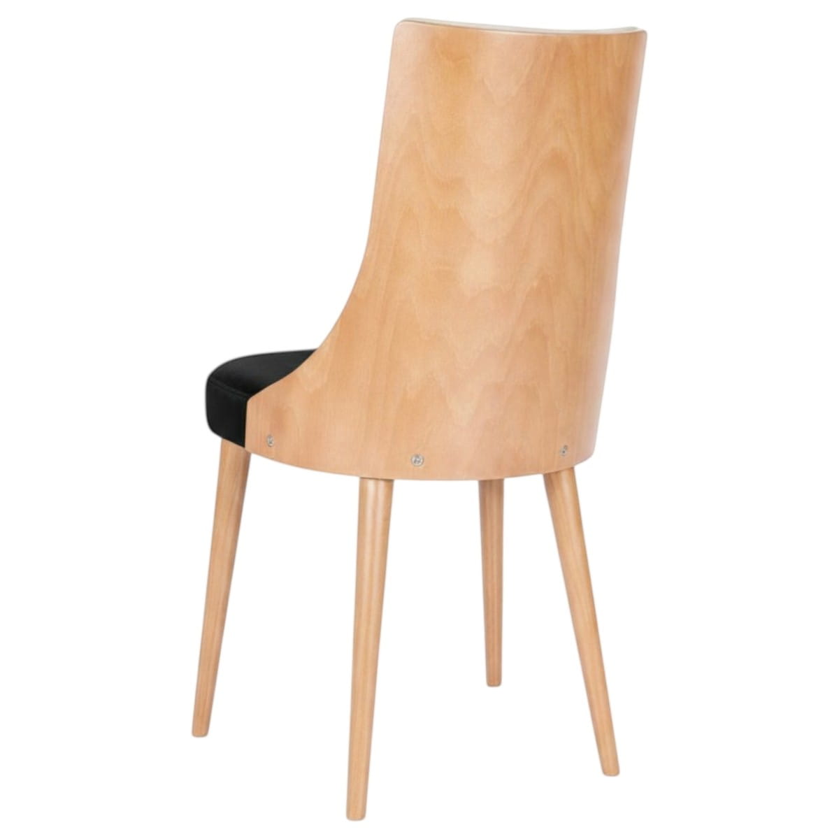 Model KT15 w czarno-drewnianej odsłonie to propozycja dla osób poszukujących mocnych, ale zarazem wyważonych akcentów do swojego wnętrza. Gęsty, niezwykle przyjemny w dotyku czarny welur Magic Velvet 2219 stanowi doskonałą przeciwwagę dla naturalnego, jasnego usłojenia podstawy w kolorze buk naturalny. To designerskie krzesło do salonu wyróżnia się nie tylko świetną ergonomią, ale przede wszystkim spektakularnym tyłem, z widoczną drewnianą powłoką na oparciu. Taka konstrukcja sprawia, że mebel prezentuje się zjawiskowo nawet wtedy, gdy jest wsunięty pod blat stołu.