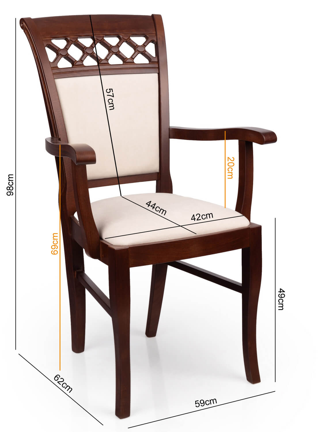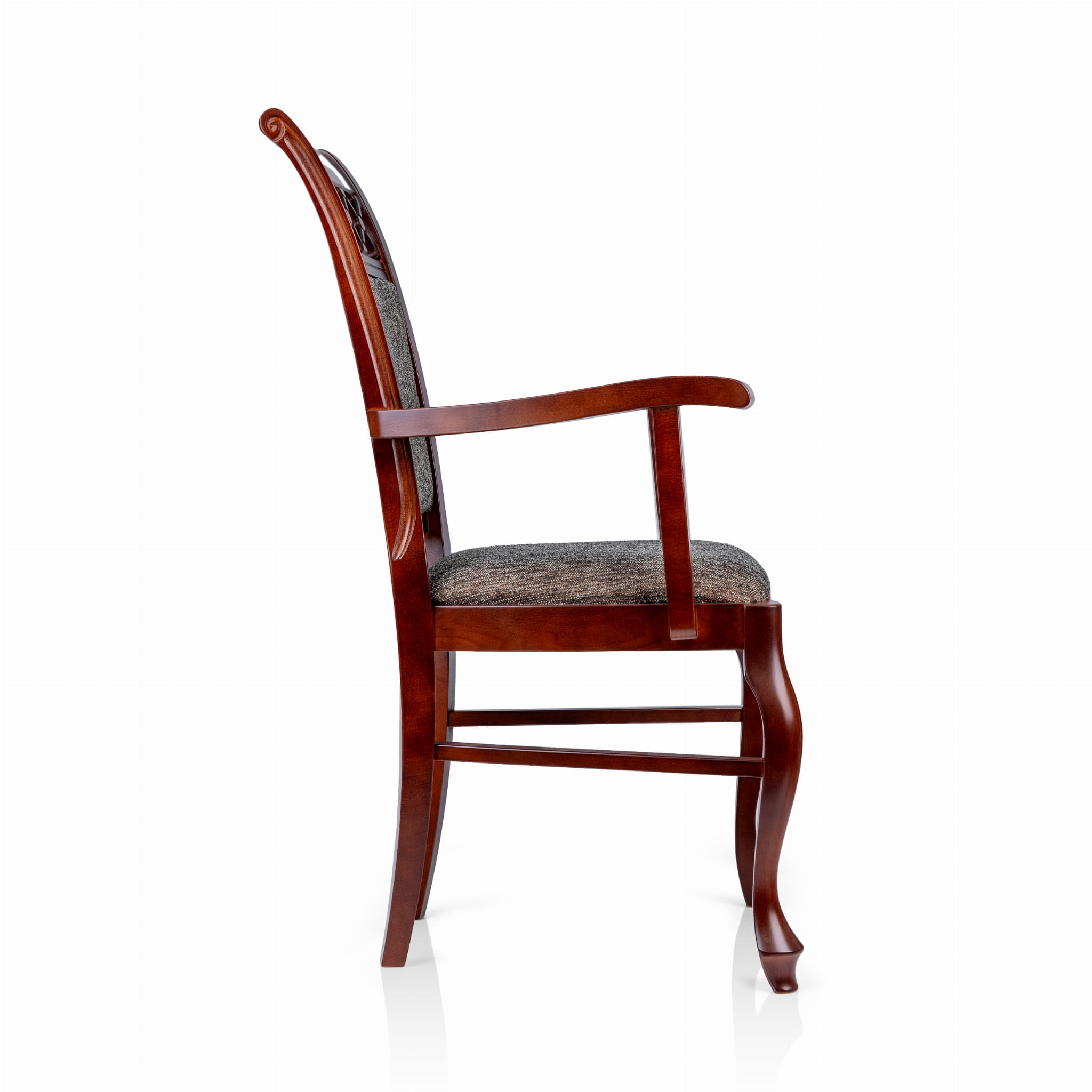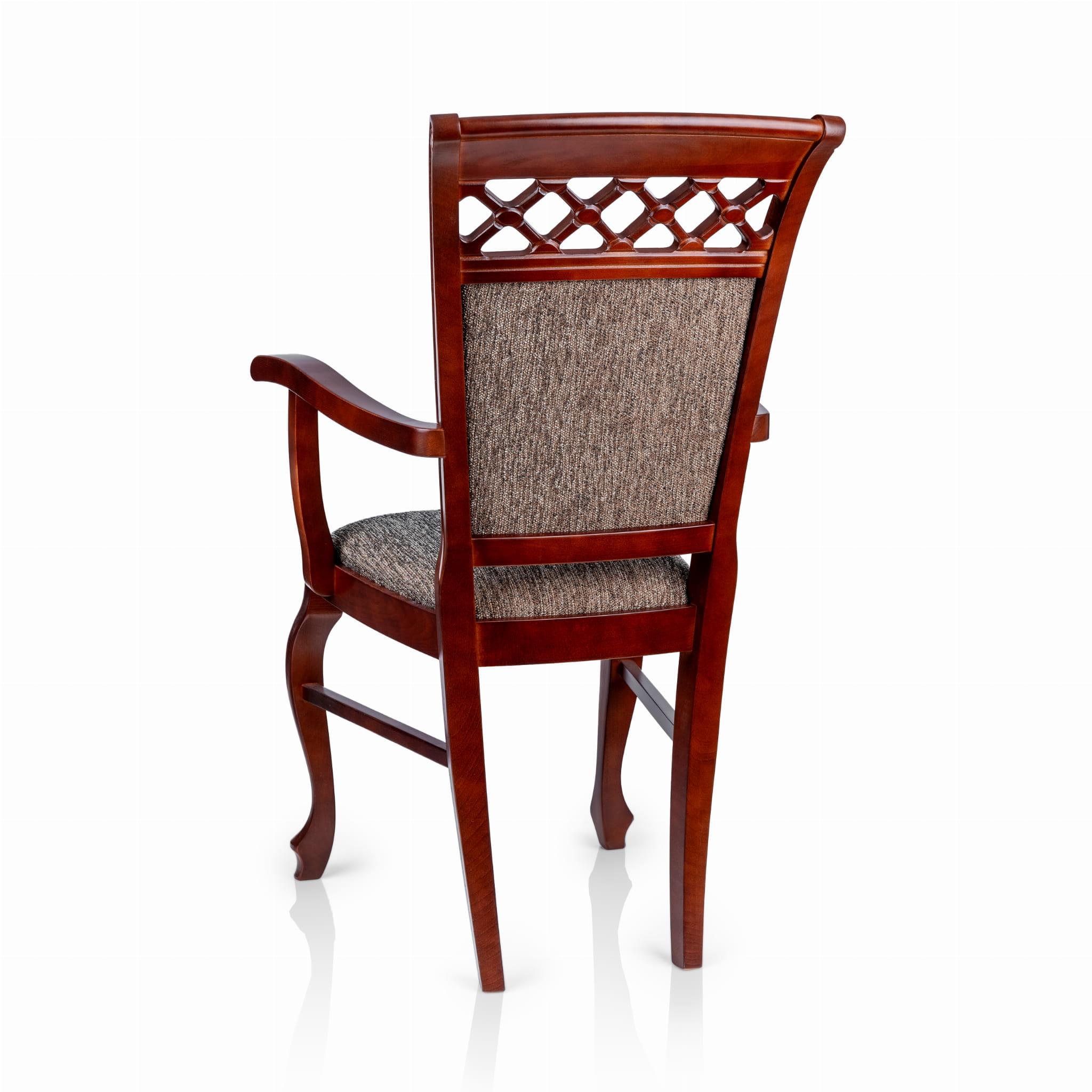 Eleganckie krzesło KT52 łączy w sobie elegancki design z klasyczną funkcjonalnością. Stelaż wykonany z naturalnego drewna w kasztanowym kolorze zapewnia stabilność i trwałość. Siedzisko, pokryte wysokiej jakości tkaniną w odcieniach brązu, jest wyjątkowo wygodne dzięki zastosowaniu miękkiej pianki.