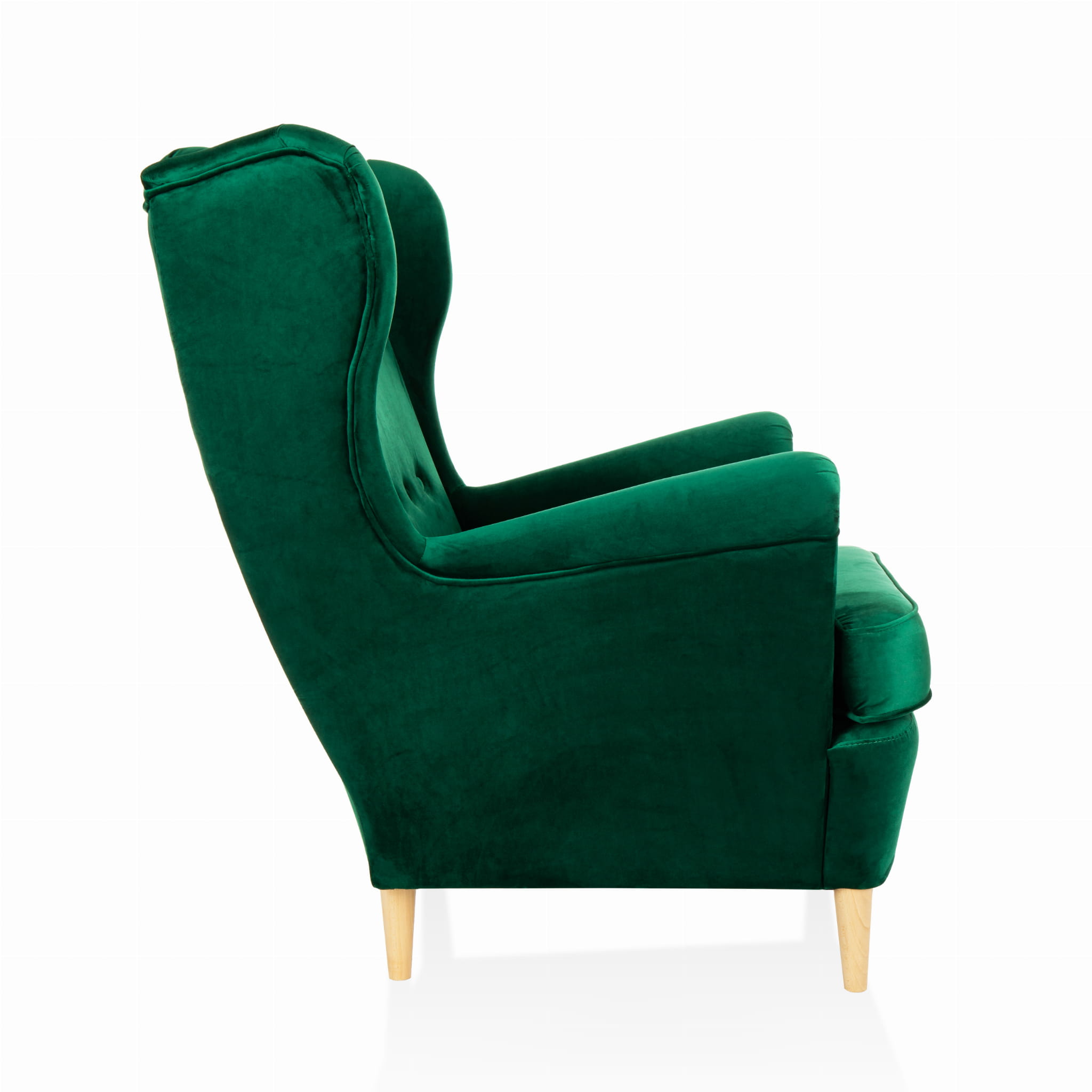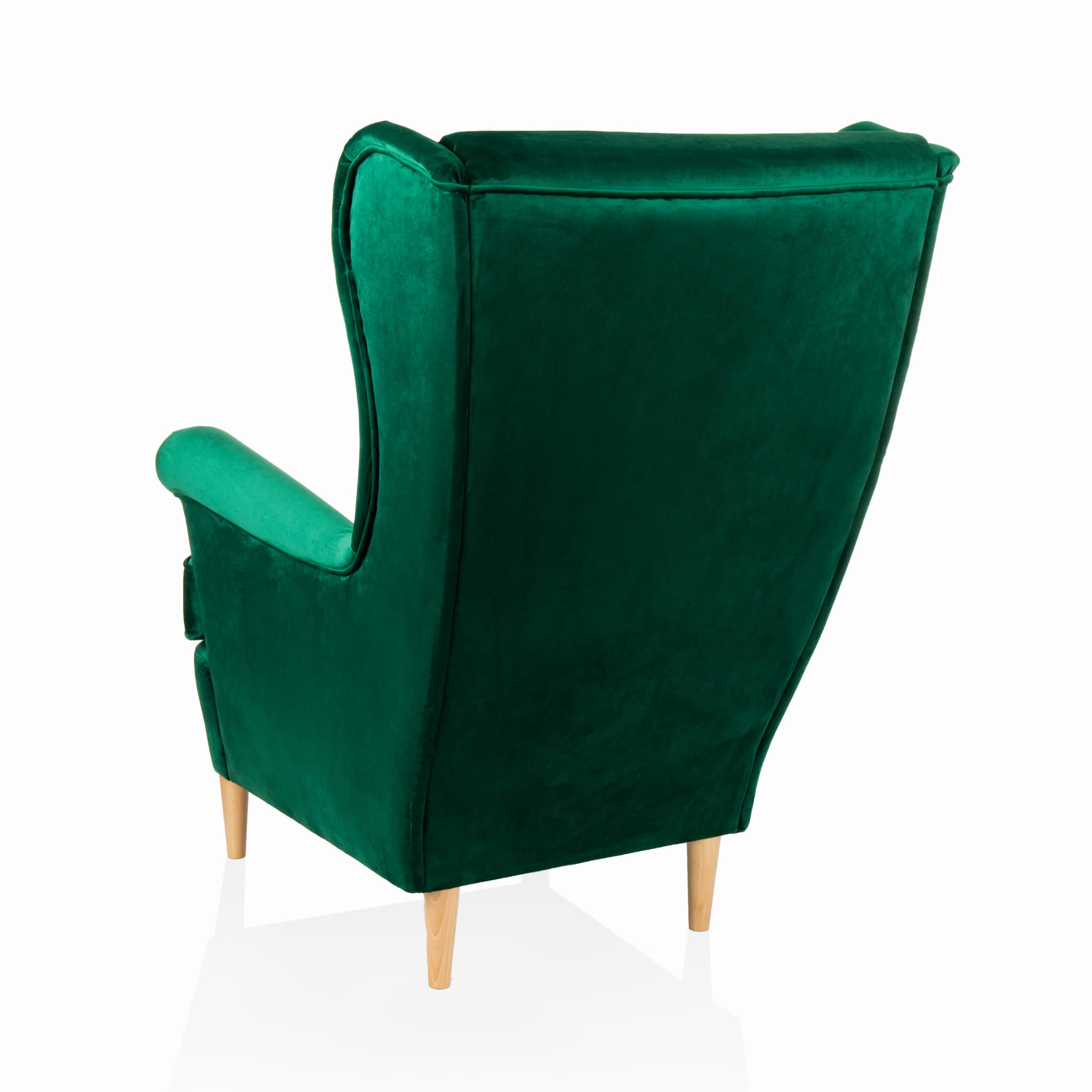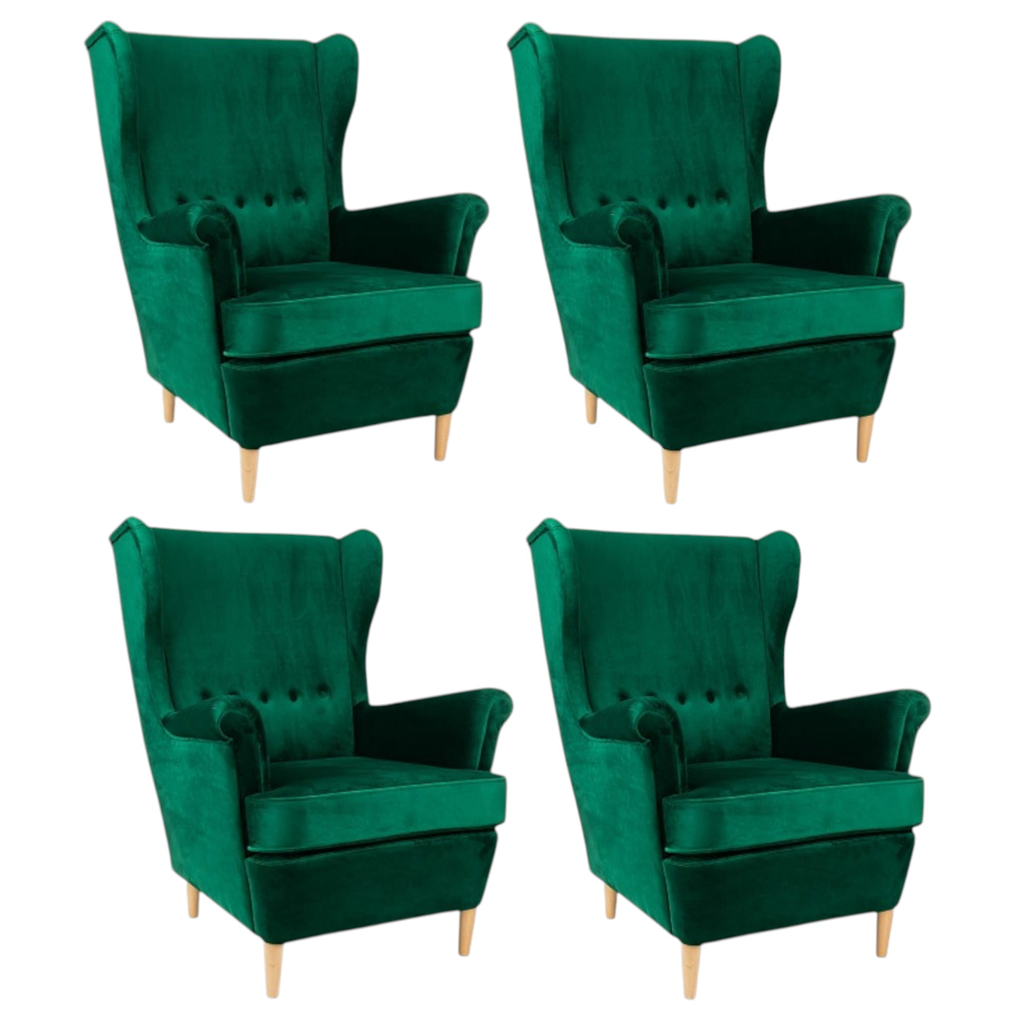 Fotel KT95 to połączenie klasycznej formy z nowoczesnym designem. Jego wysokie, wyprofilowane oparcie z delikatnym pikowaniem oraz miękkie, szerokie siedzisko zapewniają niezrównany komfort i wygodę. Tapicerka wykonana z aksamitnej tkaniny w głębokim szmaragdowym odcieniu nadaje mu luksusowego charakteru, a solidne drewniane nogi w jasnym wykończeniu dodają lekkości i stabilności.