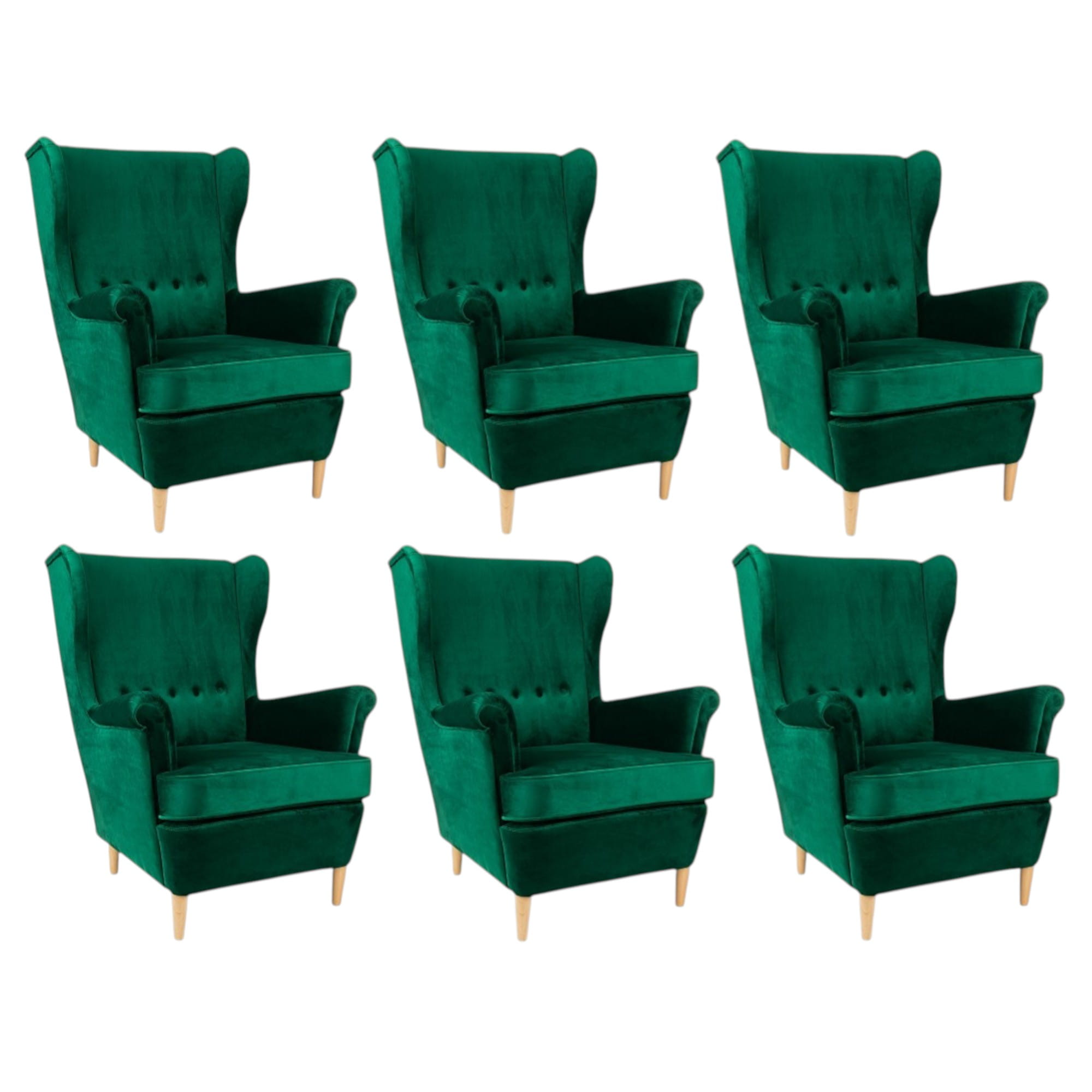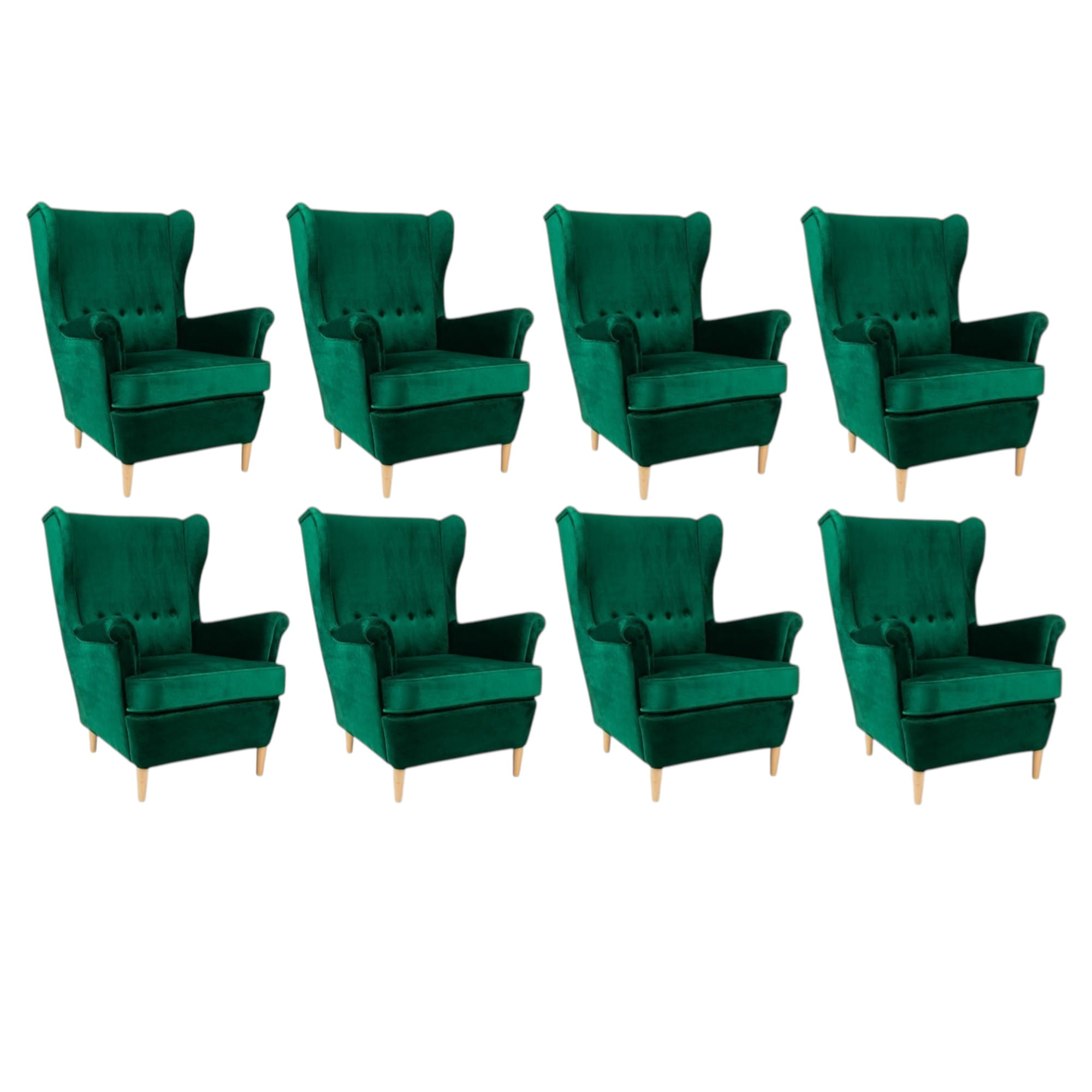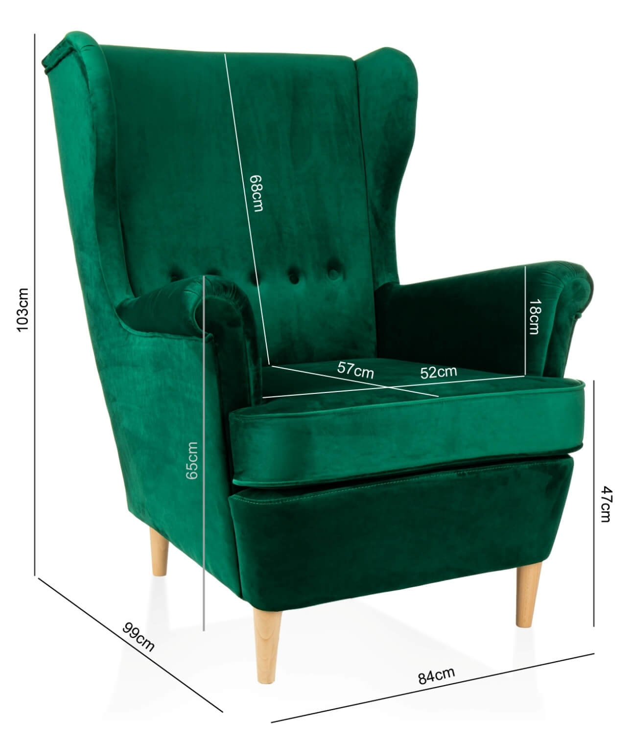 Fotel KT95 to połączenie klasycznej formy z nowoczesnym designem. Jego wysokie, wyprofilowane oparcie z delikatnym pikowaniem oraz miękkie, szerokie siedzisko zapewniają niezrównany komfort i wygodę. Tapicerka wykonana z aksamitnej tkaniny w głębokim szmaragdowym odcieniu nadaje mu luksusowego charakteru, a solidne drewniane nogi w jasnym wykończeniu dodają lekkości i stabilności.