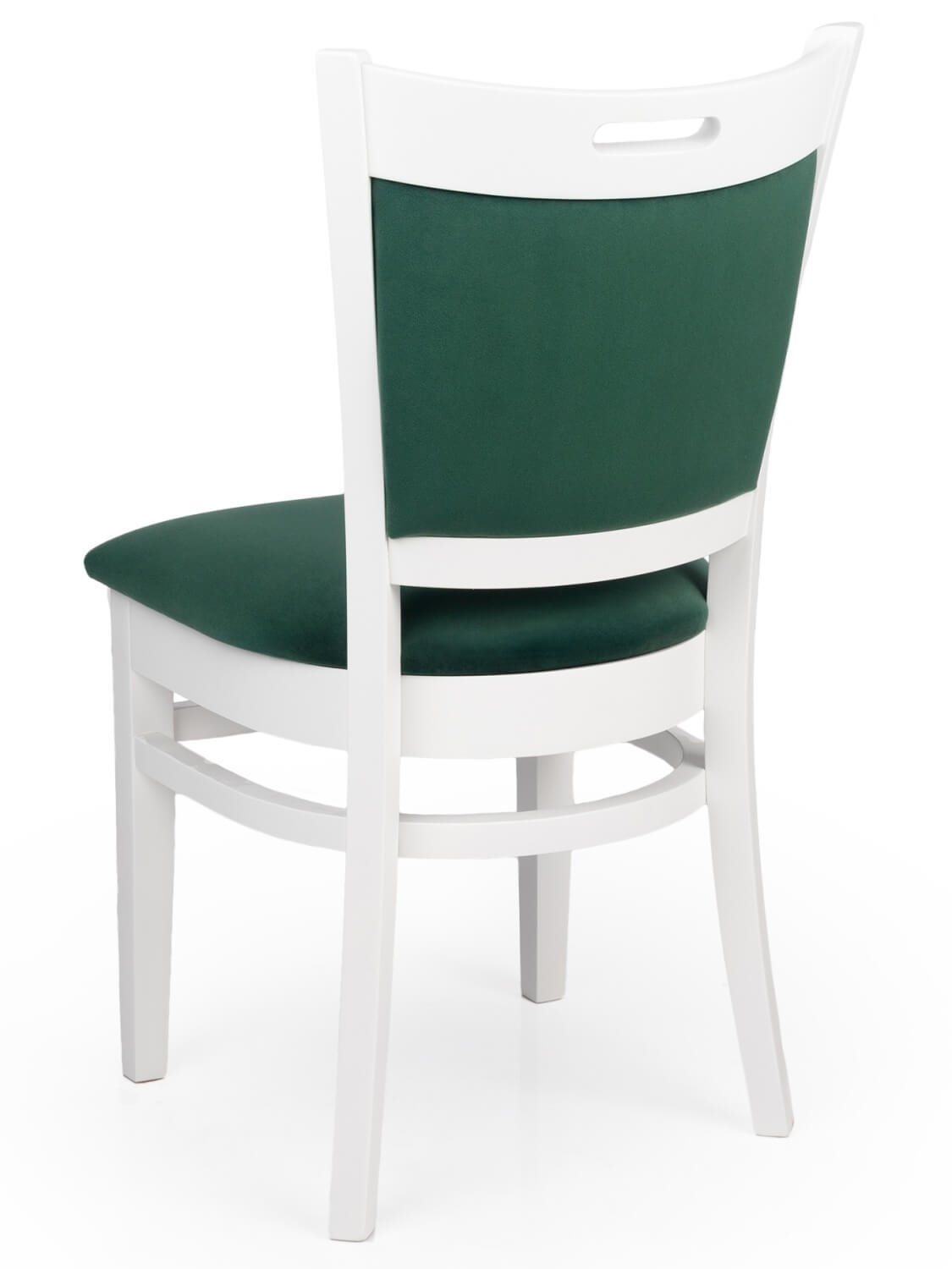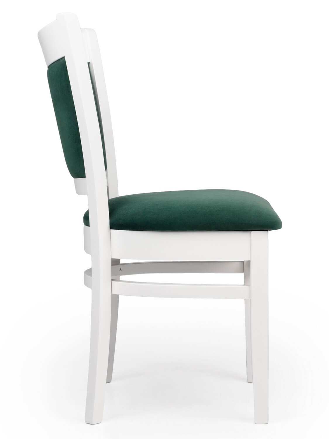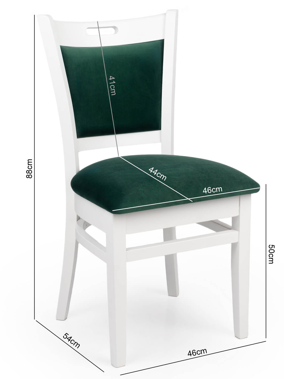 Eleganckie krzesło KT176 łączy w sobie nowoczesny design z klasyczną funkcjonalnością. Stelaż wykonany z drewna w białym kolorze zapewnia stabilność i trwałość. Siedzisko, pokryte wysokiej jakości tkaniną w odcieniu zieleni, jest wyjątkowo wygodne dzięki zastosowaniu miękkiej pianki.