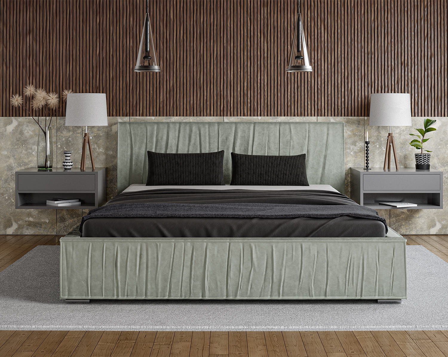 Zagłówek, boki i przód łóżka są tapicerowane wytrzymałą tkaniną zapewniającą elegancję i trwałość. Pod tkaniną znajduje się również wysokiej jakości pianka zapewniająca dodatkowy komfort snu.