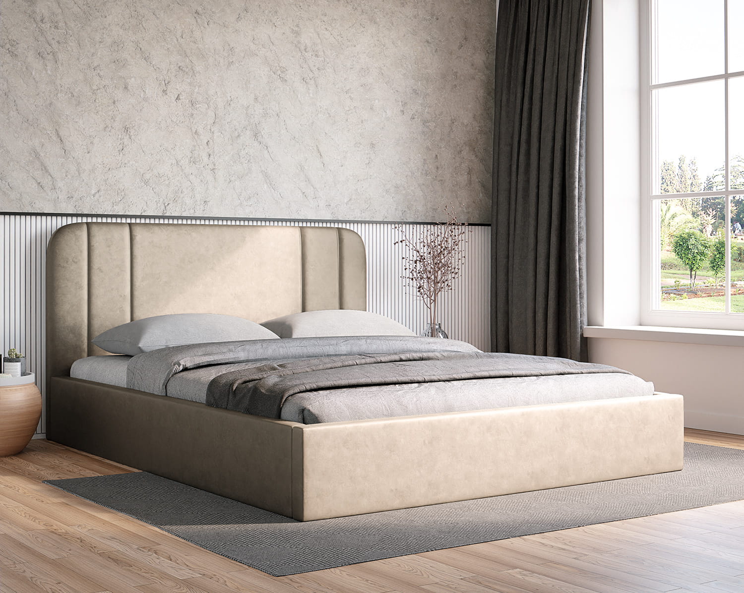 Zagłówek, boki i przód łóżka są tapicerowane wytrzymałą tkaniną zapewniającą elegancję i trwałość. Pod tkaniną znajduje się również wysokiej jakości pianka zapewniająca dodatkowy komfort snu.